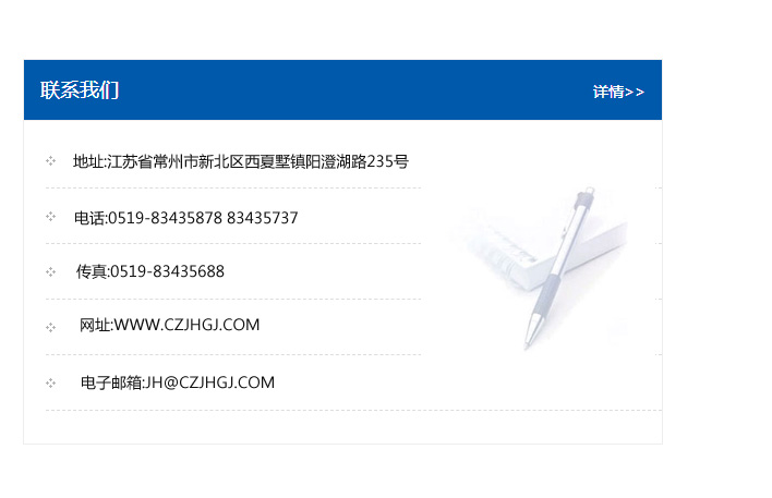 地址:常州市新北區友邦商務大廈1幢16、17層  電話:0519-85101652  傳真:0519-85112595  郵編:213022  網址:www_cz-jiayue_cn.58xfj.com  郵箱:xiajifengaa@163.com